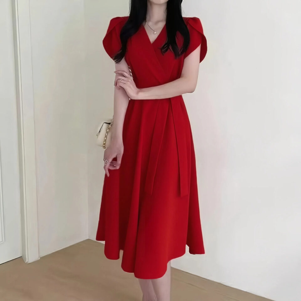 Women’s Solid-Color French-Style Cross-Neckline Lace-Up Bud Dress