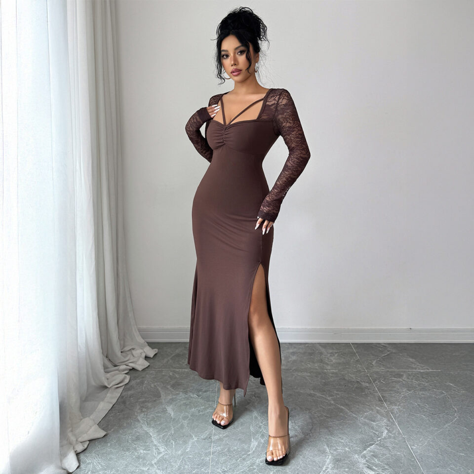 Women’s Casual Brown Square-Neck Bodycon Split Dress